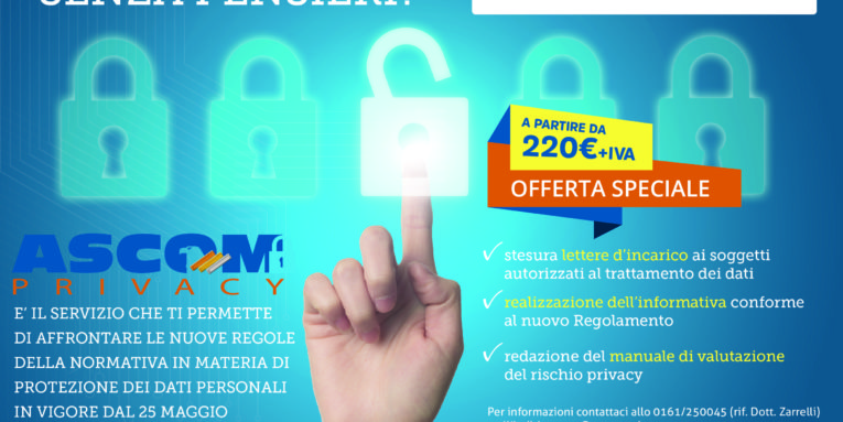 Per aziende singole: a partire da € 220,00 + IVA Vi verrà fornito l’accesso alla piattaforma Ascom Privacy dove, rispondendo ad una serie di domande inerenti la Vostra attività (in autonomia o con l’ausilio di un nostro esperto), verrà elaborata la documentazione prevista dal GDPR, che riceverete in pdf comodamente sul vostro indirizzo di posta elettronica.