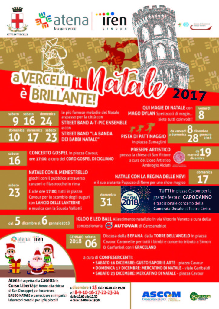 “A Vercelli il Natale 2017 è brillante!”. Comune, Atena-Iren, Camera di Commercio Vercelli Biella, Ascom e Confesercenti hanno scelto questo slogan per le iniziative che da qui all’Epifania animeranno le vie del capoluogo.